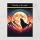 A lone wolf silhouetted against a full moon, howling in the night, with a starry sky and mountains in the background.