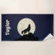 Show off your wild side with this personalised beach towel. It features a silhouette style illustration of a wolf in black howling at a pale yellow moon against a midnight blue night sky background making it perfect for anyone who loves animals. This towel is ready to be personalised with a name or other text in bold yellow lettering.