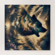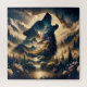 Picture within a picture. A wolf howling at the moon with a mountains and forest background.