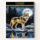 In a tranquil night setting, a majestic wolf stands atop a rocky ledge, howling towards a luminous full moon