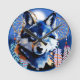 Beautiful Wolf with deep yellow eyes, with Native American Dreamcatcters, in a Wild Blue Mountains Landscape and Full Moon. Original Vector Round Logo Design isolated on white Copyright BluedarkArt TheChameleonArt.