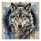 A Wolf with detailed watercolor with expressive eyes is portrayed against a soft, blurred background. The natural colours enhance the lifelike appearance.