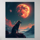 Wolf Under Blood Moon- Wolf Under Blood Moon- A lone wolf sits on a rugged Precipice overlooking a endless expanse of clouds and mountains. The sky is a deep blue, dotted with stars, and a large, fiery red moon dominates the upper right corner of the image. The moon appears to be burning, with glowing orange and yellow veins running across its surface. The wolf is silhouetted against the bright moon, its fur a dark grey against the fiery backdrop.