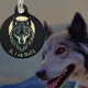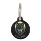 Pet tag with a gorgeous tribal wolf face in beige blue on black background.