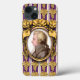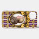 The original artwork by ZoeSPEAK on this iPhone 13 Case features a portrait of the classical music composer Wolfgang Amadeus Mozart. The portrait is a profile set in an ornate oval golden frame. The frame hangs on a purple wallpaper background with golden bunches of grapes in rows, and vertical white and lavender stripes.