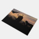 Two wolves and a flying raven on a silhouetted landscape and a clouds sunset.