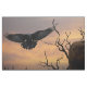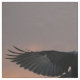 Two wolves and a flying raven on a silhouetted landscape and a clouds sunset.