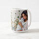 A pretty coffee mug with an illustration of a woman holding a white fluffy cat surrounded by dandelions, The picture has a crochet style fabric look.