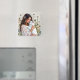 A pretty magnet with an illustration of a woman holding a white fluffy cat surrounded by dandelions, The picture has a crochet style fabric look.