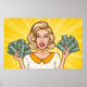 Pop art illustration of enthusiastic girl with cash Blonde young woman holds money bills in hands advertising poster for the announcement of discounts and sales in the style of pop art