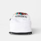 A woman affectionately embraces a Bulldog wearing a hat on her head.