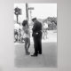 Vintage black and white photograph of a woman in a bathing suit being given a ticket by a police officer.