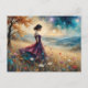 Young woman in a colourful gown, stands on a hill of flowers in a gorgeous landscape