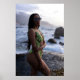 A swimsuit model wears a vibrant green swimsuit and sunglasses while standing on a rocky shoreline. The background shows a dramatic ocean and a cloudy sky.