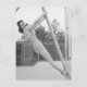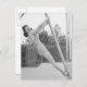 Woman in swimsuit hanging from wooden postcard
