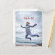 Uplifting series: A great postcard featuring a photo of a woman jumping for joy off some rocks on a beach. Her arms and legs are partially outstretched, turning it into a crab jump. She's wearing a padded jacket against the cold and her hair is lifting in the wind. With a happy expression and eyes wide, the overall impression is of wild exuberance.