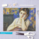 This design features a painting by the Italian Impressionist painter Federico Zandomeneghi (1841–1917). It shows an elegant young lady leaning against the back of a chair. She has her hand resting on her head and she's gently smiling. The woman has neat brunette hair and blue eyes. She is sitting in a living room with bright coloured wallpaper. There appears to be a fireplace behind her.