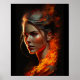 Oil painting portrait of a woman's face stylised with a garment and hair made of fire.