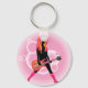 A woman in pink and black plains a guitar. This design looks really effective on these Keychain