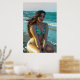 A swimsuit model sits gracefully on a beach as the wind blows her hair. The ocean waves create a serene backdrop, adding to the relaxed atmosphere.