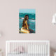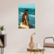 A swimsuit model with long hair and a bikini is sitting on a bench by the sea. The ocean waves and clear sky are visible in the background, creating a serene seaside setting.