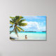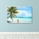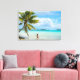 Canvas landscape print of a woman in bikinis under a hanging palm tree in the shallow water of the lagoon at the beach of a tropical island in the pacific archipelago French Polynesia.