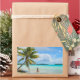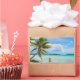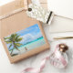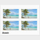 Rectangular photo sticker of a woman in bikinis under a hanging palm tree in the shallow water of the lagoon at the beach of a tropical island in the pacific archipelago French Polynesia.