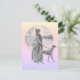 Vintage black and white illustration of a woman in dress, coat with feather boa and hat walking a greyhound breed type dog. Set on a yellow, peach, pink and blue pastel colour gradient.
