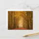 Postcard of a woman taking a walk with her dog through the morning fog on a path in a beech tree forest in autumn colours.