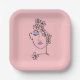 Line artwork of a female face with flowers. One line drawing. Contemporary art. Woman with flower. Woman portrait with line on pastel pink background. Minimal woman face. Women in art.
