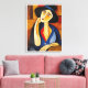 This is a painting of a woman with a hat in a modern style. The woman is wearing a black hat and a blue blouse with a red scarf. The background is made up of warm tones in a geometric pattern. The painting uses bold colours and lines to create contrast and interest. This painting would make a great addition to any art collection or as a statement piece in a room. It can also be printed on various products such as t-shirts, phone cases, etc