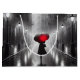 A woman with a red umbrella walks down a dark rainy city street illuminated by old lamposts.