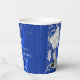 Womans blue and silver birthday party paper cups with silver glitter high heel shoes, pearls and balloons on an elegant blue satin and silver swirl background. You can add the text of your choice to these pretty blue and silver paper cups. You can remove the champagne glass.