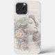 This is a beautiful iPhone case featuring the profile of a woman's face in muted tones and coloured flowers in her hair. The design has a burlap overlay which gives the case and design a textured effect and vintage feeling.