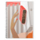 Womans hand pushing on alarm clock snooze button notebook