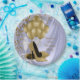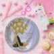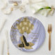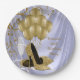 Womans lavender and gold birthday party paper plates with beautiful gold glitter shoes on a pretty lavender satin balloon, pearls and champagne swirl background. You can add your own text, and you can remove the champagne glass.