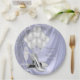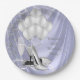 Womans lavender purple and silver birthday party paper plates with beautiful silver glitter shoes on a pretty lavender satin balloon, pearls and champagne swirl background. You can add your own text, and you can remove the champagne glass.