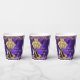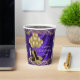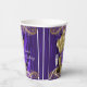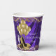 Womans purple and gold high heel shoe birthday party paper cups with gold glitter high heel shoes, pearls and balloons on an elegant purple satin and gold swirl background. You can add the text of your choice to these pretty purple and gold paper cups. You can remove the champagne glass.