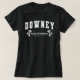 Black Downey women's T-Shirt to show that you are proud to be from this beautiful city. This letter print curved text design features "Downey" in a slab type font with "California" and "Golden State" in stylish title fonts with palm trees on either side.