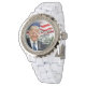 Celebrate the re-election victory of President Donald J Trump with this keepsake memento collectable wrist watch, available for men or women. Photo of President Trump with waving American Flag, the White house and words President Donald J Trump, America's 45th and 47th President. Beautiful patriotic photo theme makes a beautiful modern classic elegant gift idea for the Trump supporter Republican dad, husband or friend. Lovely keepsake from the historic 2024 Presidential Election campaign.