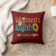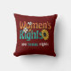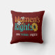 Pro Choice word art pillow features retro style "women's rights are human rights" text with daisy and sunflower floral graphics on dark red background.