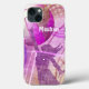 Pink women's volleyball iPhone Se/5/5s case with girly volleyball theme graphics in pink, purple and gold and silhouetted female vball player jumping at the net - customise with her name - by katz_d_zynes ::: also available for other iPhone models as well as iPad and Samsung devices ... for other devices, select your device type from the “Style Options” section on this page … for customisation assistance, simply click the “Ask this Designer” link below