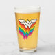 DC Pride | Wonder Woman's iconic logo with layers of rainbow colors projected behind it.