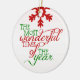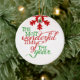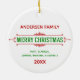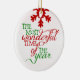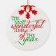 Pretty Christmas holiday ceramic ornament with our Wonderful Christmas design featuring typography red and green text that reads The Most Wonderful Time of the Year and has a red snowflake. The back has decorated text that reads Merry Christmas and an area to customise with your family name, first names, and current year!