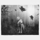Fantastic photograph of two white wolves in an enchanting forest. Unique photography shows leaves floating to the misty ground where the magnificent animals stand as one.