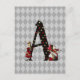 Whimsical Wonderland themed monogram postcard design features vintage Alice and the Queen of Hearts character colour illustrations with large letter / initial 'A' with a card suite fill on muted grey harlequin background.