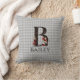 Whimsical Wonderland themed throw pillow features vintage Alice and the Queen of Hearts character colour illustrations with large letter / initial B with a black/gold/red card suites fill pattern on a vintage grey harlequin background. Personalise further with customisable name text