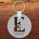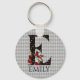Whimsical Wonderland themed keychain features vintage Alice and the Queen of Hearts character colour illustrations with large letter / initial E with a black/gold/red card suites fill pattern on a vintage grey harlequin background. Personalise further with customisable name text