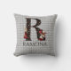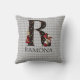 Whimsical Wonderland themed throw pillow features vintage Alice and the Queen of Hearts character colour illustrations with large letter / initial R with a black/gold/red card suites fill pattern on a vintage grey harlequin background. Personalise further with customisable name text