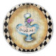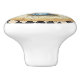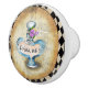 Wonderland Drink Me, Knobs & Pulls, with a black harlequin design and, a blue perfume bottle that says, drink me. The colours are ecru, black, blue, and lilac in a vintage-aged look.